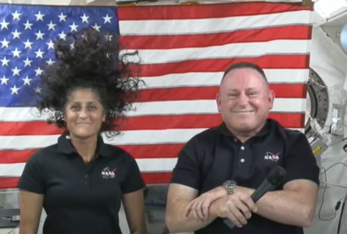 7月10日,宇航員巴里·威爾莫爾(右)與蘇尼·威廉姆斯在國際空間站與地面連線時發言。圖片來源:美國航天局