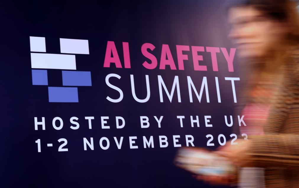 圖為2023年11月2日,在英國布萊奇利園,一名參會者經過首屆人工智能安全峰會的宣傳展板。(新華社記者李穎攝)