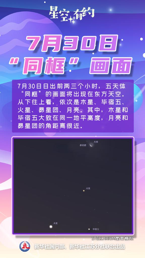 中國科學院紫金山天文臺科普主管王科超介紹,7月30日日出前兩三個小時,五天體“同框”的畫面將出現在東方天空。從下往上看,依次是木星、畢宿五、火星、昴星團、月亮。其中,木星和畢宿五大致在同一地平高度。