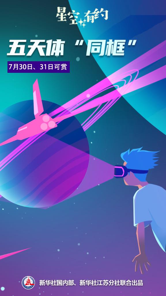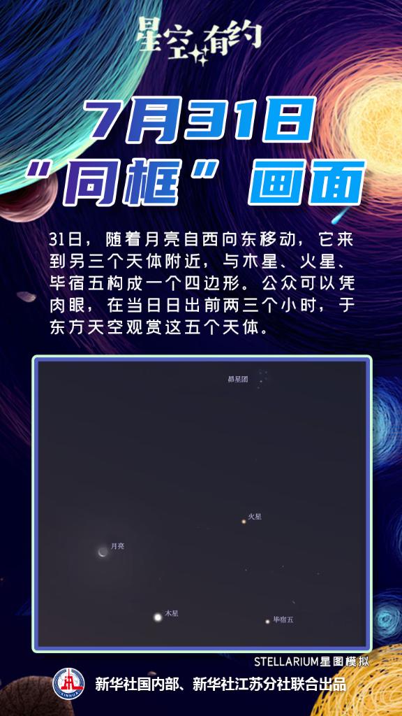 新華社南京7月28日電(記者王玨玢、邱冰清)7月30日至31日,我國黎明前的夜空會出現火星、木星、畢宿五、昴星團和月亮“同框”的畫面,感興趣的公眾可以一觀。
