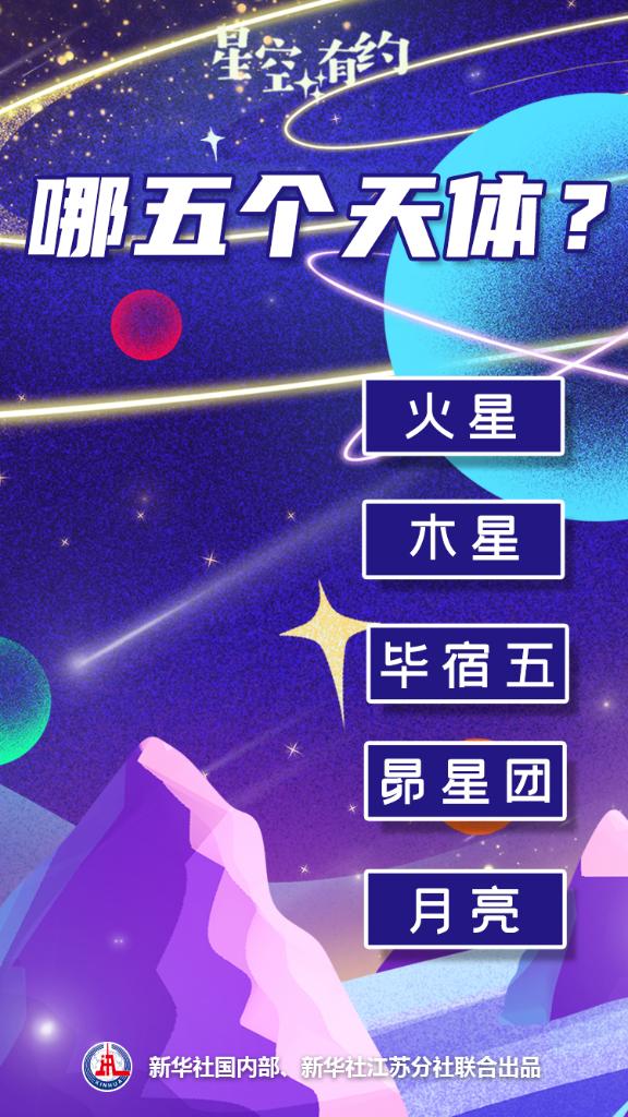 “觀賞五天體‘同框’是一個增長天文知識的好機會。如果借助望遠鏡,你會看到更多天體細節,如木星的大紅斑和它的四顆大衛星、昴星團中的單顆恒星、月亮的環形山等?!蓖蹩瞥f。