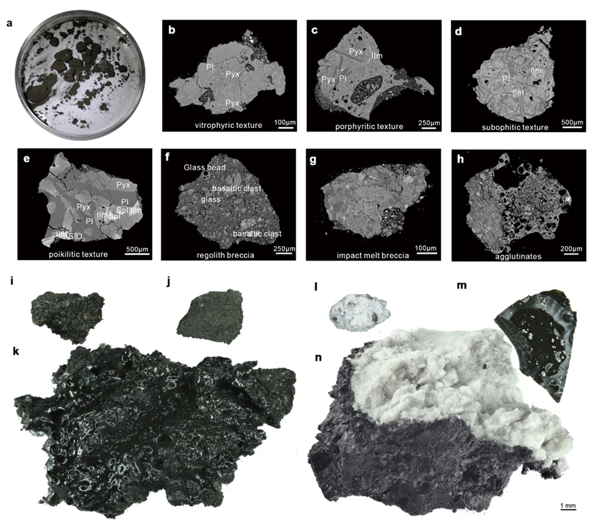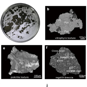 礦物學分析顯示,嫦娥六號月球樣品的主要物相組成為斜長石(32.6%)、輝石(33.3%)和玻璃(29.4%)。此外,樣品中還檢測到少量的斜方輝石,暗示了非玄武質物質的存在。