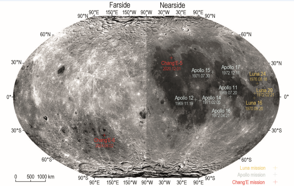 嫦娥六號與嫦娥五號、美國Apollo計劃及蘇聯Luna計劃落點示意圖。(中國科學院國家天文臺供圖)
