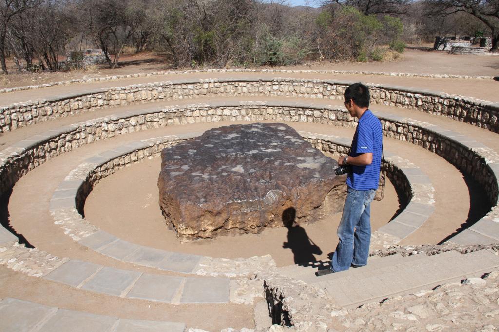 2013年10月22日,在納米比亞北部小城赫魯特方丹,一名游客參觀納米比亞戈巴隕鐵。新華社記者高磊攝