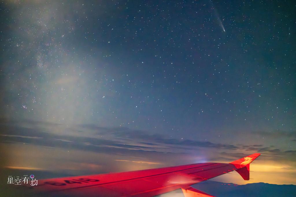 10月25日在民航客機上拍攝的紫金山-阿特拉斯彗星與銀河同框。(鐘奕攝)