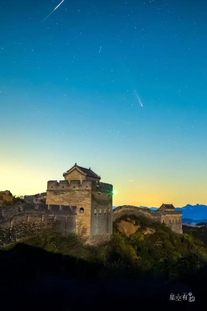 10月19日在河北金山嶺長城拍攝的紫金山-阿特拉斯彗星與流星同框。(孫思攝,星聯CSVA供圖)