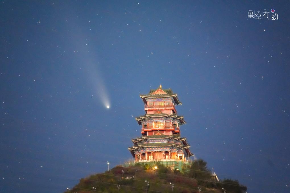 10月22日在北京門頭溝區拍攝的紫金山-阿特拉斯彗星與定都閣同框。(王俊峰攝)
