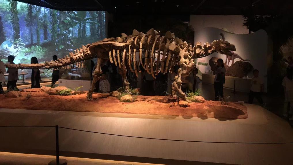 江西省博物館內的“獸紋華夏胄龍”的骨骼裝架。(吳潔 攝)