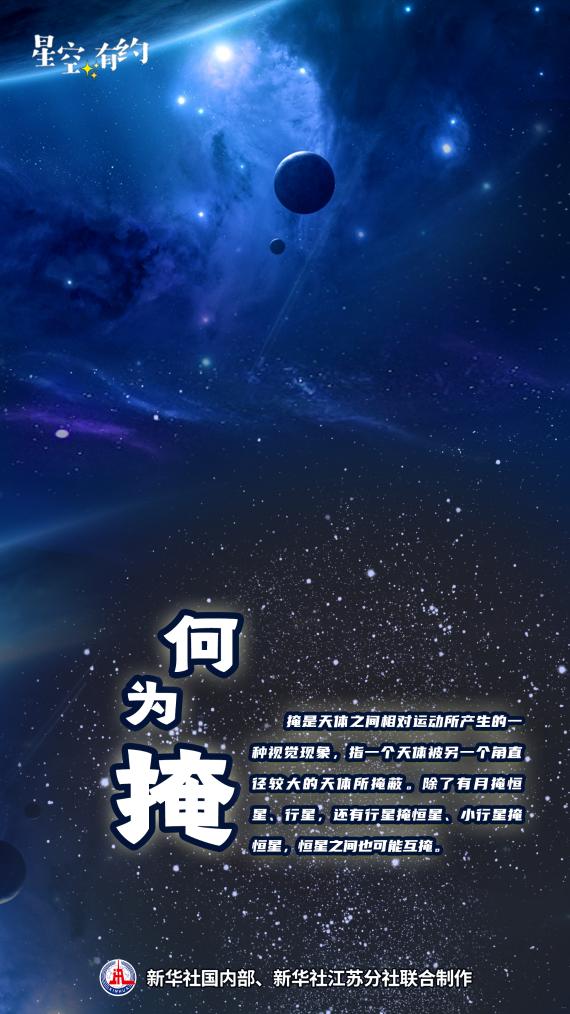 何為掩?中國科學院紫金山天文臺科普主管王科超說,掩是天體之間相對運動所產生的一種視覺現象,指一個天體被另一個角直徑較大的天體所掩蔽。掩發生在兩個天體地心視赤經或地心視黃經相同時,也就是天文學上的合。換言之,發生掩時,兩個天體必然相合,但因為地球表面不同地區的觀測者視角存在差異,通常掩發生時,僅部分區域內的觀測者可以見掩,其他區域的人則可見合。