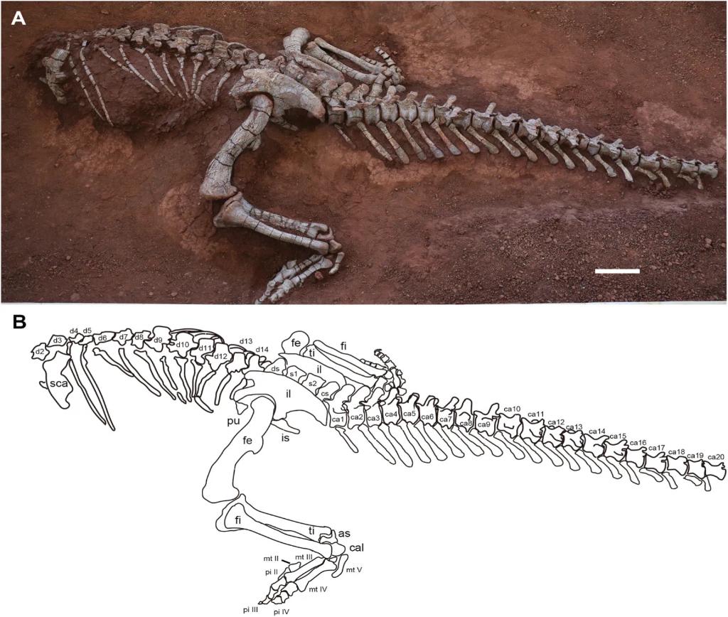 岳氏星宿龍骨骼化石及素描圖。(中國科學院古脊椎動物與古人類研究所供圖)