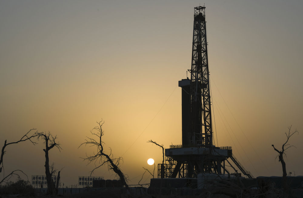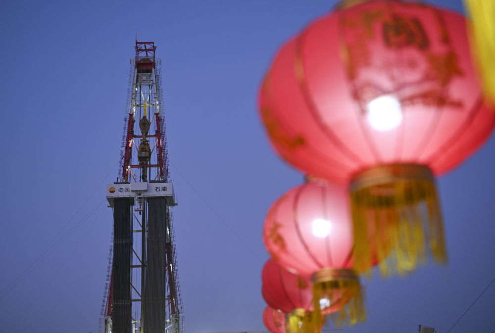 2025年2月18日在新疆塔克拉瑪干沙漠腹地拍攝的中國石油塔里木油田深地塔科1井。新華社記者 胡虎虎 攝