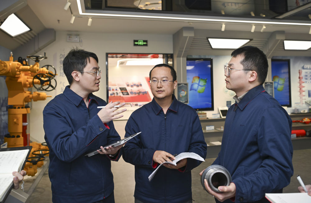 2025年2月18日,中國石油塔里木油田油氣工藝研究院鉆井項目部青年科研人員在一起交流。新華社記者 胡虎虎 攝
