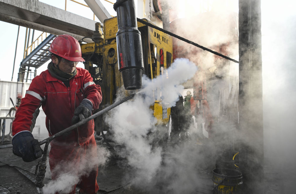 2025年2月19日,工人在中國石油塔里木油田深地塔科1井上施工。新華社記者 胡虎虎 攝