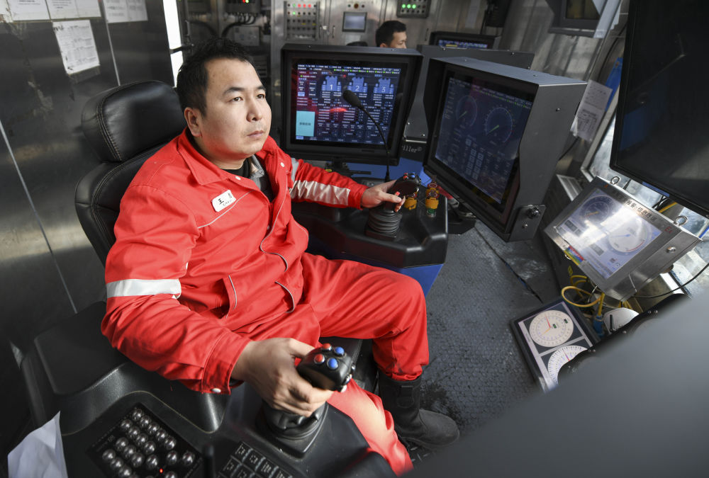 2025年2月19日,司鉆在中國石油塔里木油田深地塔科1井上操作設備。新華社記者 胡虎虎 攝
