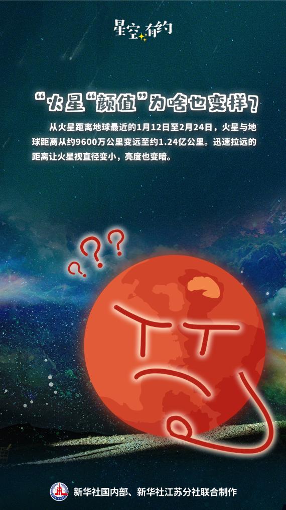 1月12日,火星運行至本輪會合周期中距離地球最近的位置,從這一天至2月24日的40多天里,它離地球的距離變遠了29%,亮度變暗了約60%,從明亮的紅星變得稍顯暗淡。