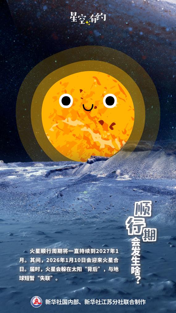 “從2月24日開始,火星順行周期將一直持續到2027年1月。2026年1月10日會迎來火星合日,屆時,火星會躲在太陽‘背后’,與地球短暫‘失聯’?!蓖蹩瞥榻B。