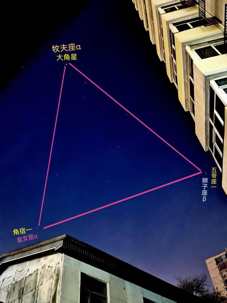 角宿一與獅子座的五帝座一、牧夫座的大角星,形成著名的春季大三角,整個春天都高掛于天空。接近正三角形狀的春季大三角,加上獵犬座的常陳一,排列成一個鉆石形狀,就是大名鼎鼎的春季大鉆石。
