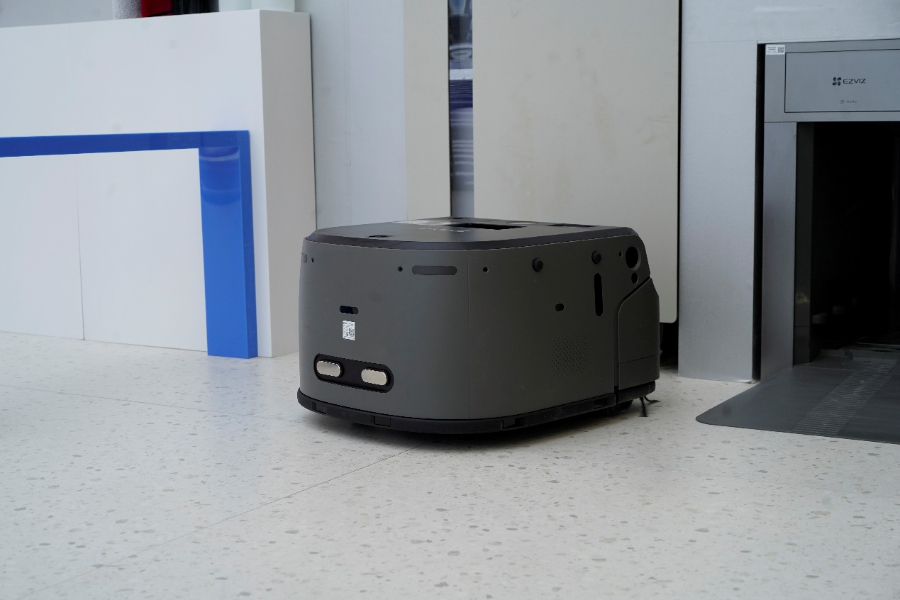 在智慧商用空間區,螢石云視覺商用清潔機器人BS1商用清潔機器人正在模擬商場地面清潔,D型緊湊機身輕松鉆入桌底、物品間隙,還可貼邊清掃、井回字形清掃,小巧且靈活。清潔完回到基站,機器人還可自主完成充電、加排水、清潔污水箱等任務,高度自動化,真正實現了無需人工值守。