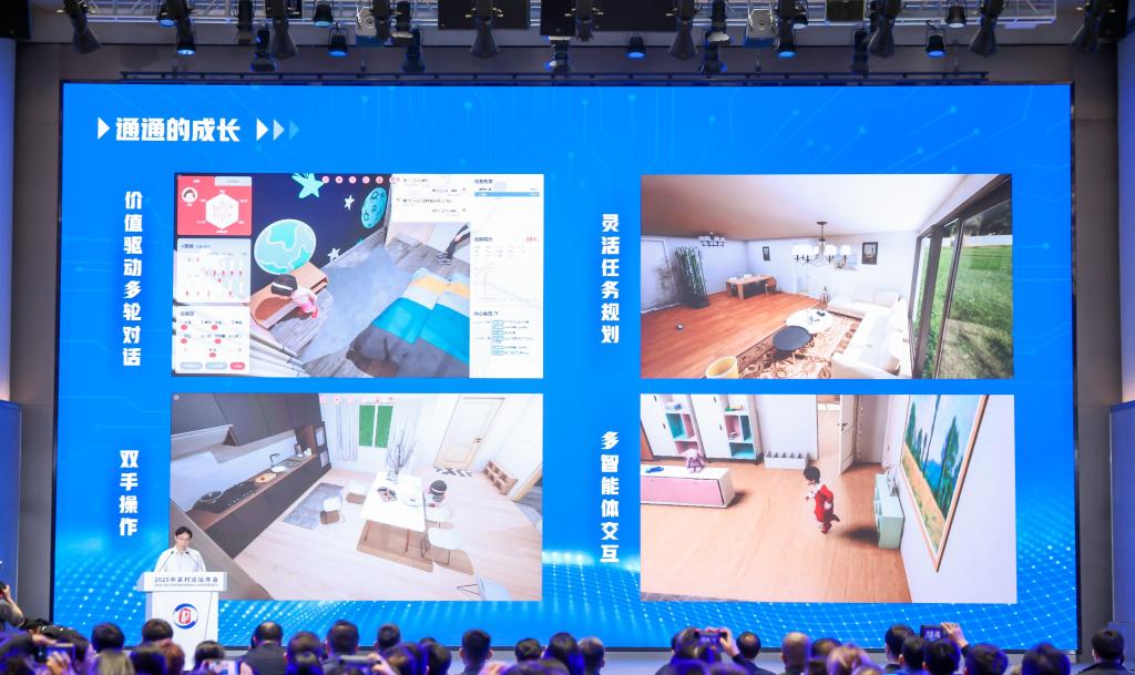 2025中關村論壇年會通用人工智能論壇上,演講者介紹“通通”的能力和特點。(北京通用人工智能研究院供圖)