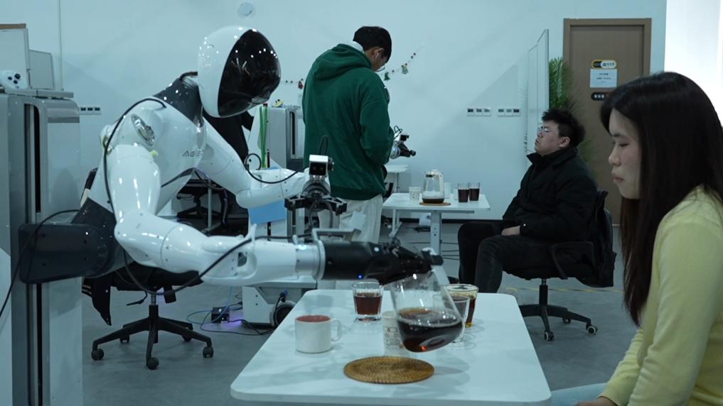 一個4000平方米的數據采集中心,就是機器人們的訓練場。今天,它們正在模擬居家、餐廳、超市、小賣部等日常生活場景,學習各種技能:清理衣物、端茶倒水,整理超市貨架,還能協作鋪桌布……這個過程并不簡單,比如說,在我們人類眼中極其簡單的倒水這件事,機器人可能需要學習數百次:要會往杯子A里面倒水,也要會往杯子B里倒水,當杯子被臨時挪開,或者光線變暗了,機器人都要做到應對自如,不會把水灑到外面。