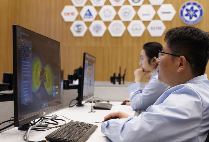在位于北京懷柔的子午工程綜合信息與運控中心,科研人員在監測運行情況(2025年3月20日攝)。新華社記者 金立旺 攝