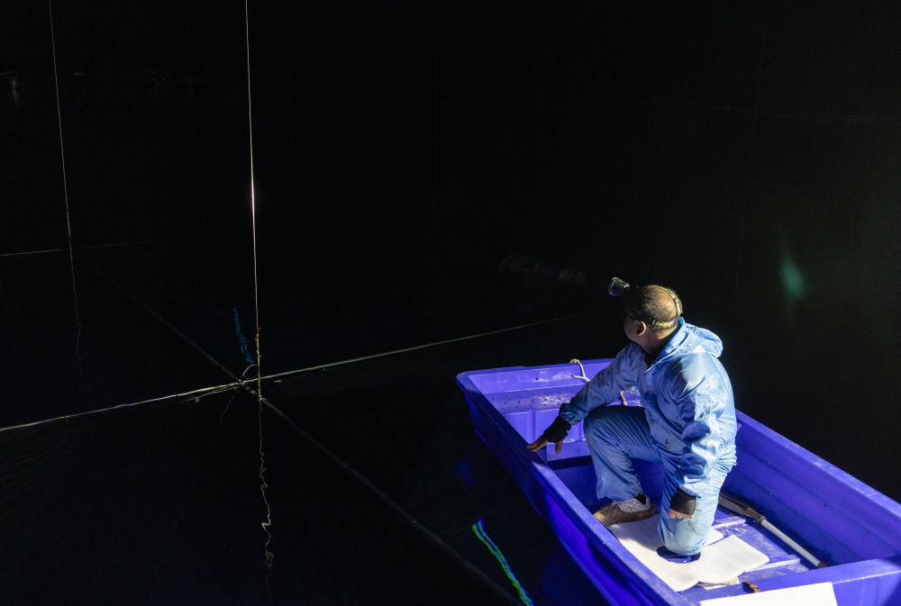 在位于四川省稻城縣海子山的高海拔宇宙線觀測站“拉索”水切倫科夫探測器陣列水池,科研人員坐船更換實驗設備(2023年4月21日攝)。新華社記者 金立旺 攝