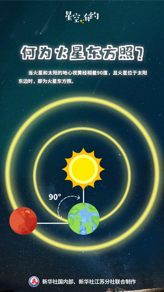 中國科學院紫金山天文臺科普主管王科超介紹,當火星和太陽的地心視黃經相差90度,且火星位于太陽東邊時,即為火星東方照?!叭绻┮曁栂档钠矫?,此時會看到太陽、地球、火星形成了一個直角,地球處于直角的頂點?!?/p>