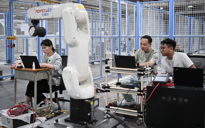 2025年3月25日,在東莞的廣東拓斯達大嶺山生產基地,工作人員在測試工業機器人產品。新華社記者 鄧華 攝