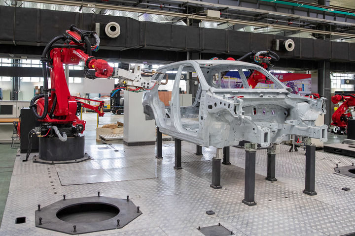 這是2024年6月12日在遼寧省沈陽新松機器人自動化股份有限公司拍攝的白車身點焊機器人。新華社記者 李旭倫 攝