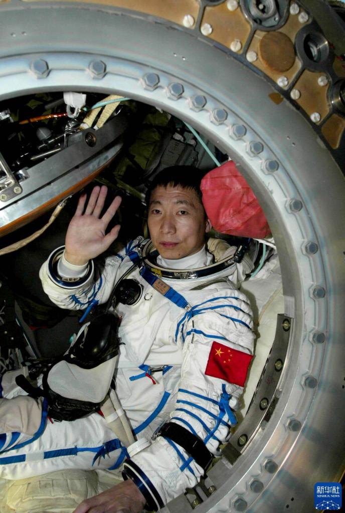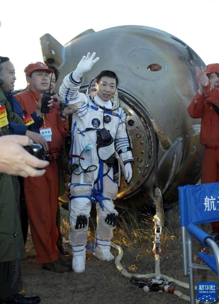 2003年10月16日,神舟五號載人飛船在內蒙古主著陸場成功著陸,航天員楊利偉在返回艙艙口向人們揮手致意。