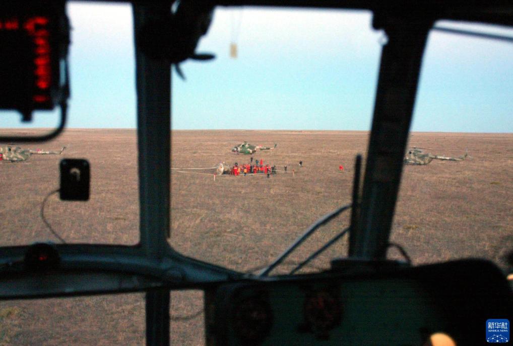 6時28分,我乘坐的直升機飛抵已經著陸的“神五”返回艙上空。透過駕駛艙的減速玻璃,我看到返回艙安穩平臥,巨大的主傘已經分離飄落在百米開外,先到達的飛機已經依次降落,地面處置的各項工作迅速展開。