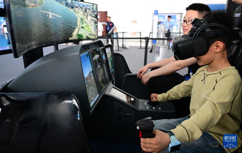 4月26日,小朋友在第三屆中國(安徽)科技創新成果轉化交易會上體驗一款駕駛艙模擬器。