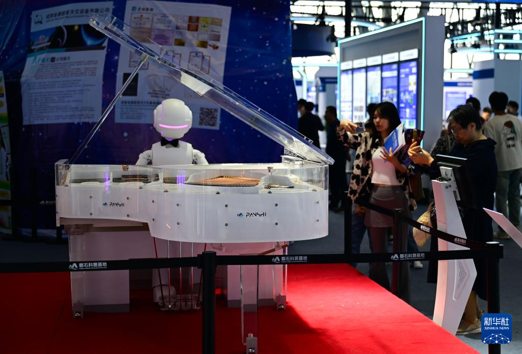 4月26日,觀眾在第三屆中國(安徽)科技創新成果轉化交易會上觀賞一款彈鋼琴的機器人。