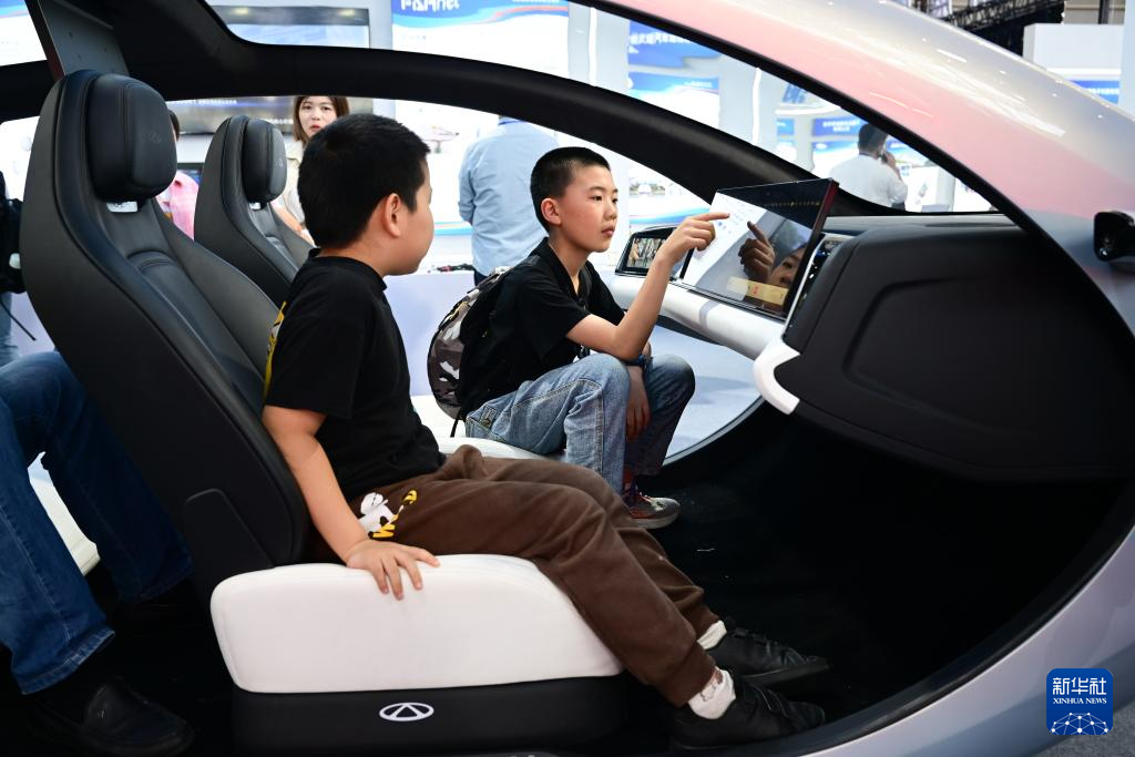 4月26日,小朋友們在第三屆中國(安徽)科技創新成果轉化交易會上體驗一款智能座艙。