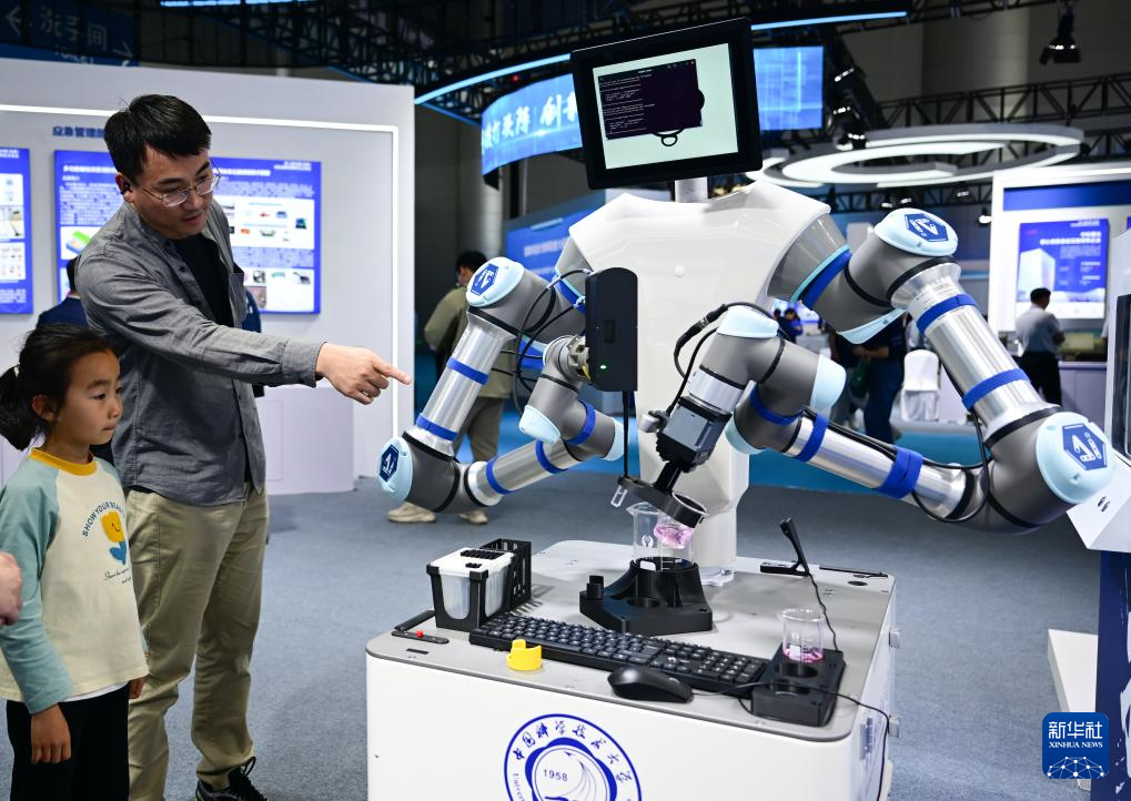4月26日,觀眾在第三屆中國(安徽)科技創新成果轉化交易會上參觀一款數據驅動的全流程機器化學家。