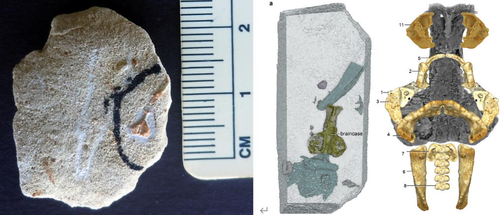 南方古椎魚化石照片(左)、三維重建(中)及各骨片生活位置恢復圖(右)。(中國科學院古脊椎所供圖)