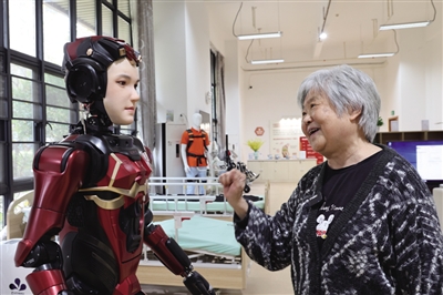 在深圳市養老護理院,一名老人與人形機器人“夏瀾”互動。新華社記者 梁旭 攝