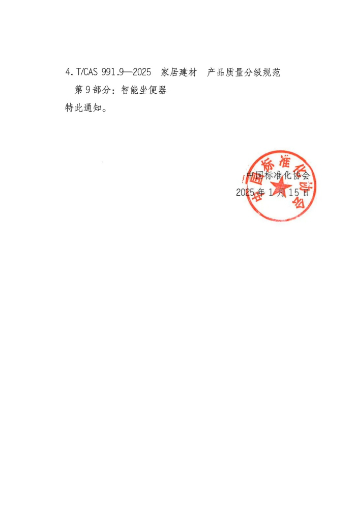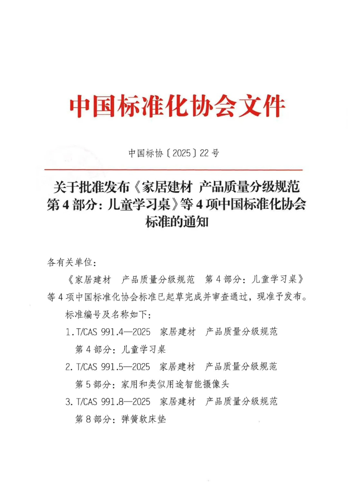 近日,中國標準化協會批準發布《家居建材 產品質量分級規范 第4部分:兒童學習桌》(T/CAS 991.4-2025)、《家居建材產品質量分級規范第5部分:家用和類似用途智能攝像頭》(T/CAS 991.5-2025)、《家居建材產品質量分級規范第8部分:彈簧軟床墊》(T/CAS 991.8-2025)、《家居建材產品質量分級規范第9部分:智能坐便器》(T/CAS 991.9-2025)四項團體標準。