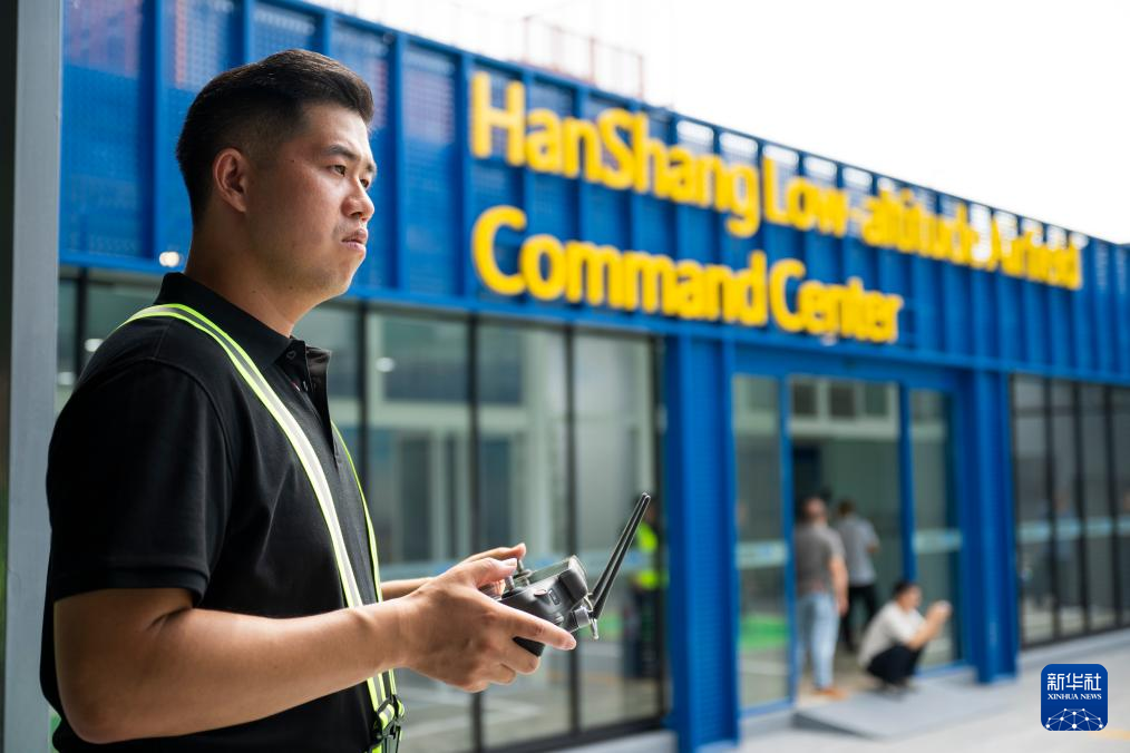 6月16日,在漢商低空港停機坪,一名工作人員在操控無人機起飛。