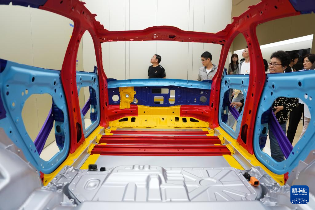 6月16日,參觀者在北京小米汽車工廠的科技展廳了解小米汽車鎧甲籠式鋼鋁混合車身。