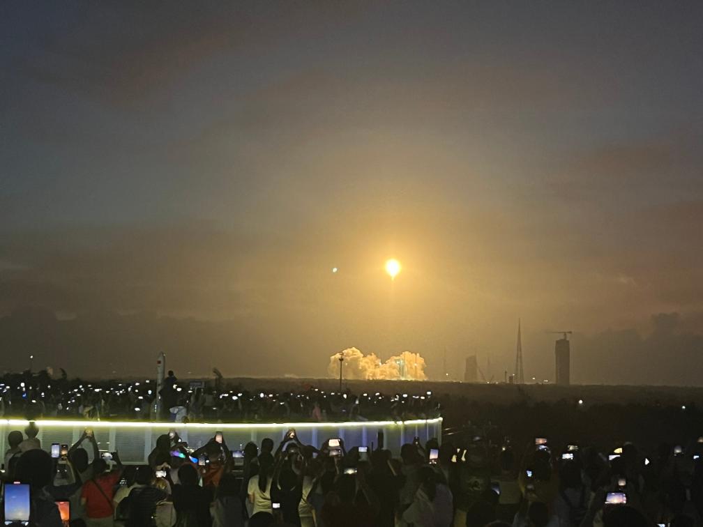 新華社???月16日電(記者羅江)“5,4,3,2,1,點火!”隨著倒計時結束,長征七號遙十運載火箭將天舟九號貨運飛船送入蒼穹。15日5時34分,近2000名觀眾在文昌瑤光火箭觀禮平臺上仰望,沉浸式體驗火箭點火升空的震撼。