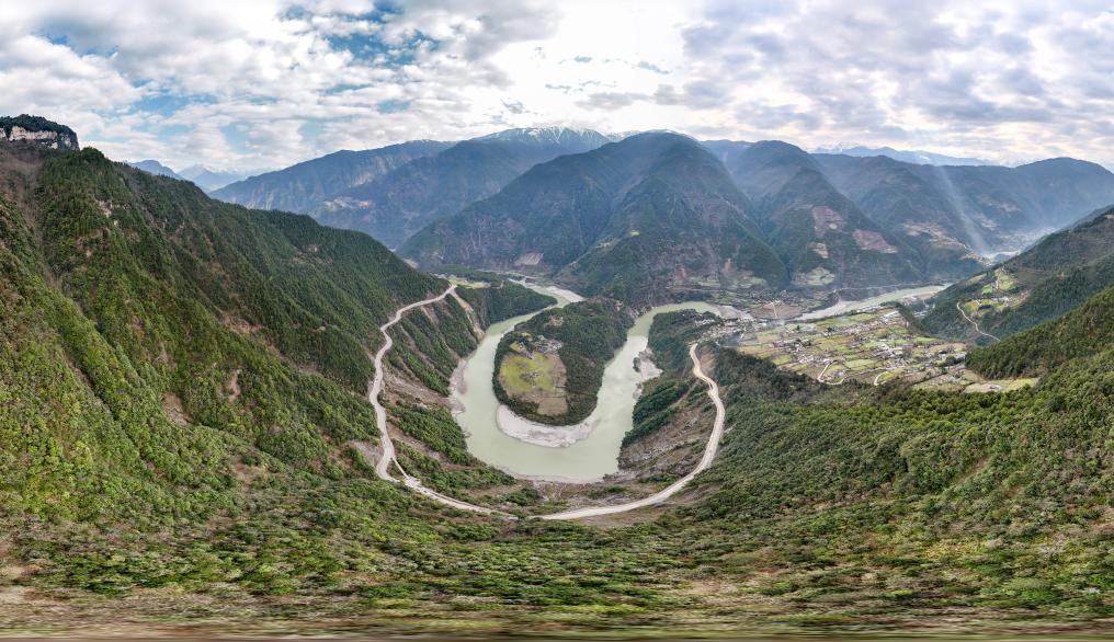 在怒江州貢山縣丙中洛鎮拍攝的怒江第一彎(無人機全景照片)。新華社發(彭奕凱 攝)