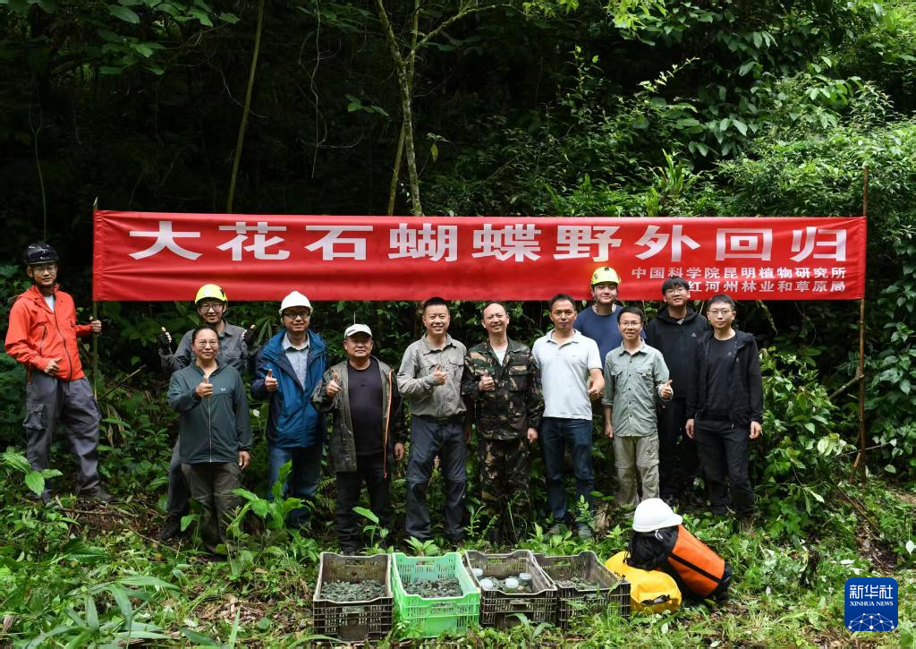 6月20日,工作人員在云南蒙自天坑將大花石蝴蝶幼苗移栽到該物種的原生境后合影。新華社發(中國西南野生生物種質資源庫供圖)