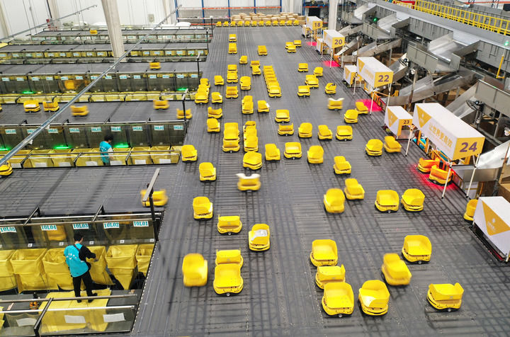 浙江省湖州市德清縣乾元鎮第一產業智慧物流園區快魚服飾有限公司華東物流中心,800余臺分揀“小黃人”機器人在精準配送各類服飾(無人機照片,2024年11月7日攝)。新華社發(倪立芳攝)