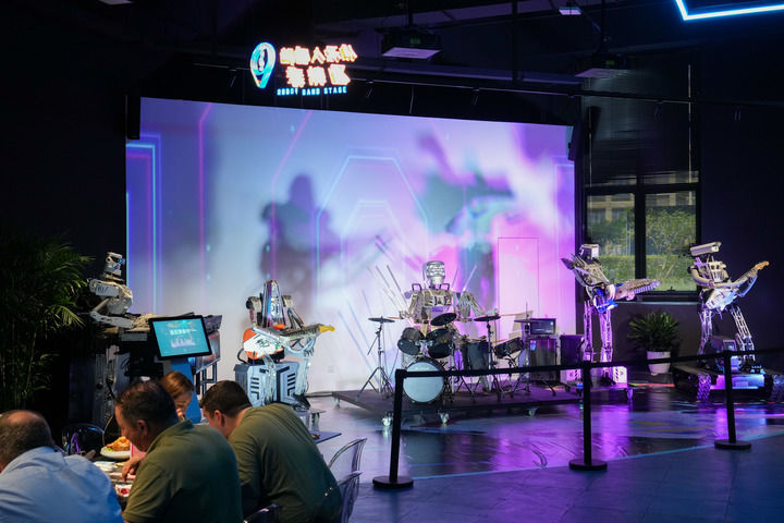 在位于北京經開區的“機器人焰究所”主題餐廳內,機器人樂隊在進行表演(2025年8月6日攝)。新華社記者 鞠煥宗 攝
