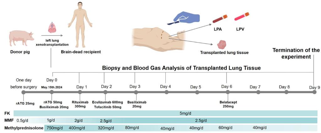 廣州醫科大學附屬第一醫院教授何建行率領的研究團隊,將一只經過基因編輯的巴馬香豬左肺移植到一名腦死亡者體內,模擬臨床常見的單肺移植手術。該供體豬經過6處基因編輯,以降低其器官移植到人體后的免疫風險。手術后,呼吸、血液、影像等監測數據顯示,移植肺維持通氣與氣體交換功能長達9天,其間未發生超急性排異反應,同步病原學監測也未發現活躍感染跡象。