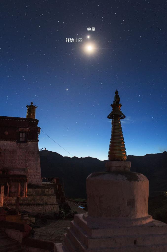 這是在西藏甘丹寺拍攝的金星、軒轅十四和月亮。(資料圖片,戴建峰 攝)