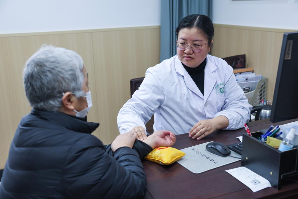 2024年12月13日,在浙江省湖州市環渚龍泉街道社區衛生服務中心中醫館,醫生在給老人進行中醫診療。新華社記者 徐昱 攝