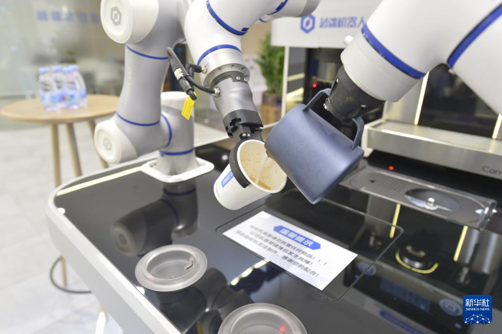 10月29日,在廣東深圳越疆科技有限公司,機器人制作咖啡拉花。新華社記者 劉力航 攝