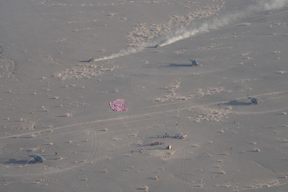↑11月14日,載著神舟二十號航天員乘組的神舟二十一號載人飛船返回艙在東風著陸場成功著陸。新華社記者 李志鵬 攝